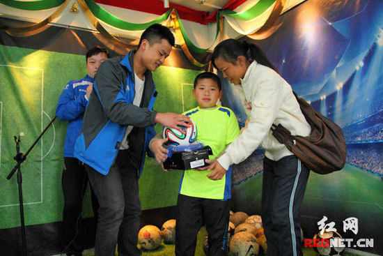 宏碁电脑(上海)有限公司长沙分公司负责人(左)为小湘湘赠送足球和“装备”。