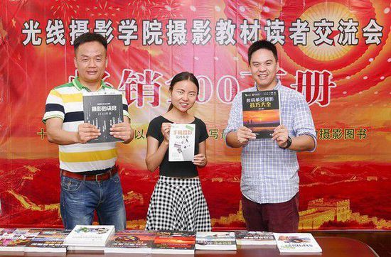 北京光线摄影学院官方教材的作者熊枭、曾兰、杨品正在展示图书