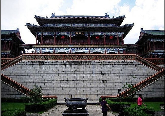 在圆明新园内逛,看了几场表演,什么格格出嫁、垂帘听政之类的,处处笙歌处处欢笑。那里面的建筑都还造得挺像回事,雕廊画栋,亭台楼阁,皇帝皇后宫女太监各司其职,游客骆驿不绝。