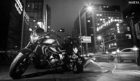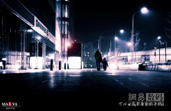 用大的光圈拍摄夜景可以很好的进行背景虚化体现出夜色的一种朦胧神秘的美。这张照片我用了两盏灯和一个反光板。正面的主灯是保证人物面部的正确曝光背部的辅助灯是用来保证人物不至于明暗对比太强,也有另外的作用是避免人物暗部融入背景。用板的作用基本相同。感光度我用的100 因为有闪光灯的原因所以感光度可以低一些。曝光时间1/2s 是保证背景也能够正确曝光不至于太黑。不过,夜景拍摄一般还是离不开后期的修饰的比如我后期把地上的光线的色温调的低了一些这样就不会因为过亮而影响人物主体,在照片的左边我加了一些蓝色的光更体现出夜色的神秘感。