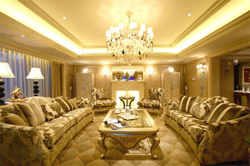客厅:如果房间较高,宜用三叉至五叉的白炽吊灯,或一个较大的圆形吊灯,这样可使客厅显得富丽堂皇。但不宜用全部向下配光的吊灯,而应使上部空间也有一定的亮度,以缩小上下空间亮度差别。