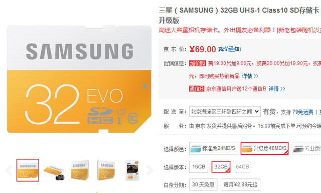 三星EVO SD存储卡自从上市就引起了极大的关注,32GB容量可存储37270张图片,1110分钟视频或者是14990首歌曲,让用户可以更加放心的享受它带来的极致体验,不需为容量担忧。标称速度达到48MB/s,拥有32GB容量,京东商城仅售69元,性价比超高,感兴趣的朋友可点击进入京东购买。