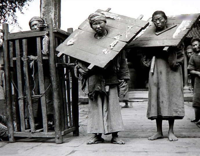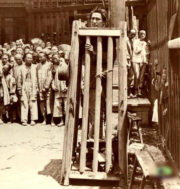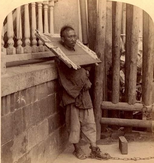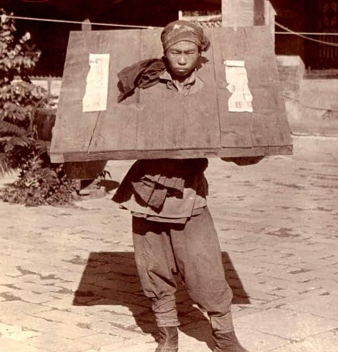 清代的斩立决、绞立决犯人由各府、厅、州、县审讯,有情节重大、罪不可赦罪名者,行刑时罪犯由监狱提出,讯明姓名、验明身首,当堂赏以酒、肉、饭食各一碗,届时一声炮响,刽子手举刀一挥,人头落地,取其首悬挂于市南门城墙或三牌坊枭首示众。图为戴木枷的人,摄于1902年。