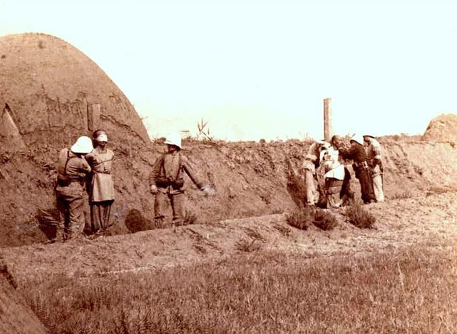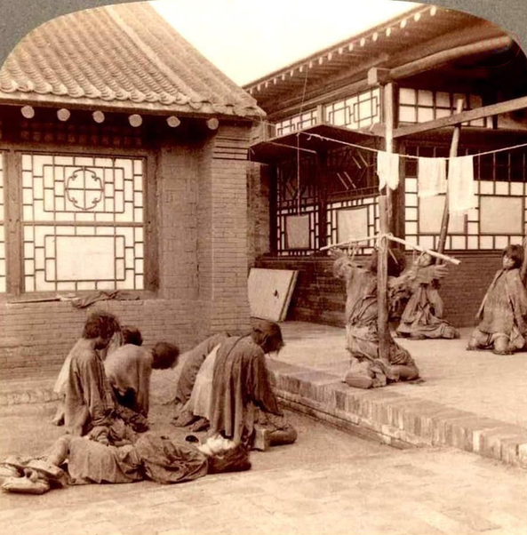 摄于1900年义和团运动期间,不知叫什么名目。那个在院子里倒卧的男子已经死了。