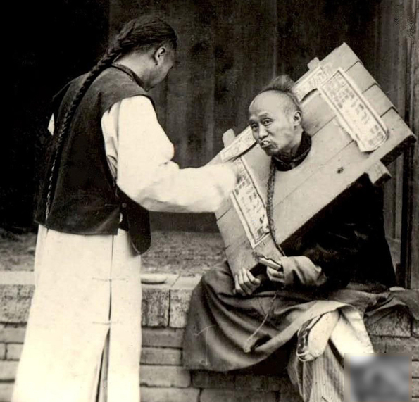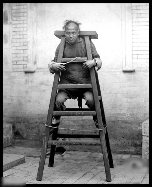 清代刑法本是依据明代刑罚而定的,但在严刑中废除了腰斩、廷杖两刑,表面上有所减轻,实际仍非常残酷。照片上的那个人不是罪犯。他是在摄影者的指导下做示范。这种姿势不能站起来。不能坐下。几天之后受刑者是什么样的状态也就可想而知了。