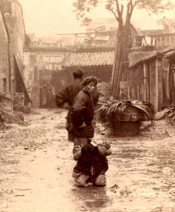 清代刑法为笞、杖、流、徒、死五刑,死刑分为凌迟、斩决枭首、斩、绞。斩、绞又分为斩立决、斩监候、绞立决、绞监候。图为刽子手准备履行其职责 ,一人被斩首。泥泞的地面上跪着被定罪的人(可能是义和团)。1900年。