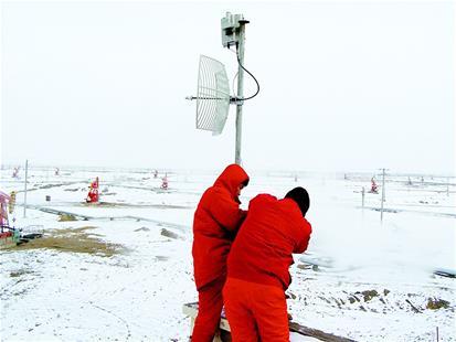 图为:武汉信达易通公司员工在克拉玛依油田架设无线通信设备。(资料图片)
