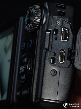 机身右侧则只设计了AV接口与HDMI接口,两个接口外有一片保护盖,防止灰尘进入。机身正面右侧佳能的logo下方设计了持握手柄,持握手柄采用了仿皮纹橡胶材质的覆皮,大大提升了使用时的手感。