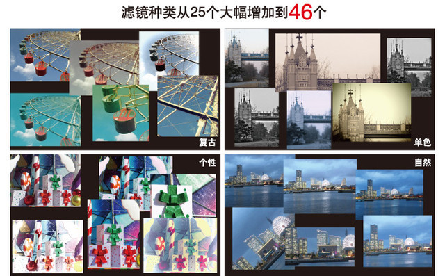 相机内置了一个有趣的功能,就是拥有46种滤镜效果的“创意拍摄”模式,这种模式下,一次快门会连拍6张图片,其中一张为原片,另外五张为添加了不同滤镜效果的创意图片,根据佳能官方的解释,这5张图片所使用的滤镜效果既不是固定的也不是随机的,而是相机根据场景分析“智能”的挑选并加载的滤镜。