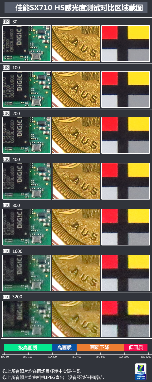 只有超长的焦距还是不够的,因为长焦端镜头失光严重,所以需要相应的提高感光度来保证快门速度,机身对噪点的控制能力还是很重要的,下面我们就来看看相机在各档位感光度下对噪点的控制能力。下面拍摄均在同一条件下进行,使用三脚架固定相机,采用延时10s拍摄,最大限度的减少机震,保持成像的稳定性,拍摄采用JPEG直出,图片未经过任何修改均为原图。