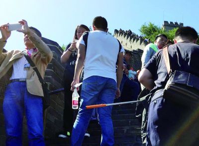 一位身揣自拍杆的游客,让本已狭窄的长城通道变得更加难走摄/记者徐琨尧