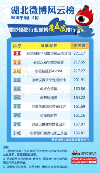 2015年第1季度#湖北微博风云榜#婚纱摄影行业榜单(覆盖度)