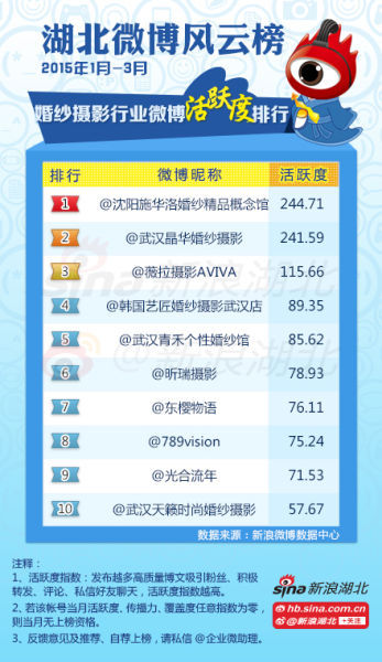 2015年第1季度#湖北微博风云榜#婚纱摄影行业榜单(活跃度)