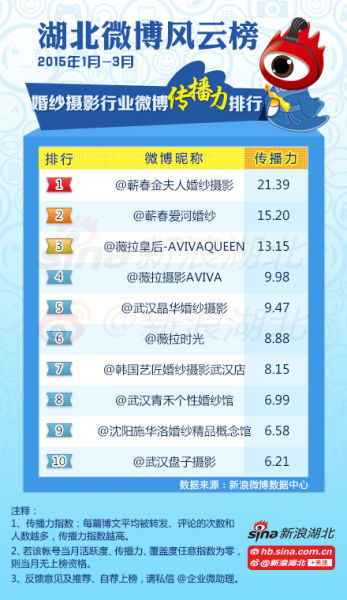 2015年第1季度#湖北微博风云榜#婚纱摄影行业榜单(传播力)